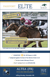 Altea, a 2020 Keeneland November graduate who sold for $200,000 in Book 1, makes her debut for new connections in the G3 Robert J. Frankel at Santa Anita on Sunday. Previously owned by Swift Thoroughbreds, Madaket Stables and Doheny Racing Stable and trained by Chad Brown, the five-year-old French-bred mare is now owned by MyRacehorse and trained by Richard Mandella.