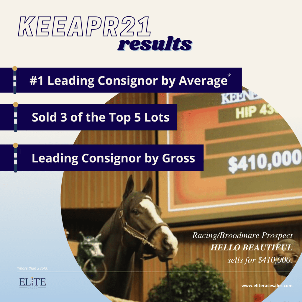 ELiTE continues to prove itself as the clear leading consignor of horses of racing age and our results at the 2021 rendition of the Keeneland April sale reflect that. We know the market better than anyone and buyers trust the stock that we bring to auction, in turn getting sellers top-dollar for their sales prospects.